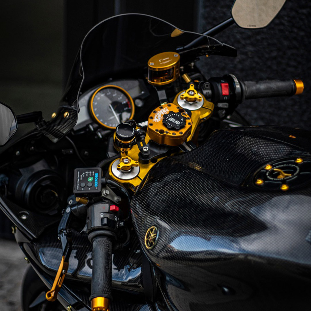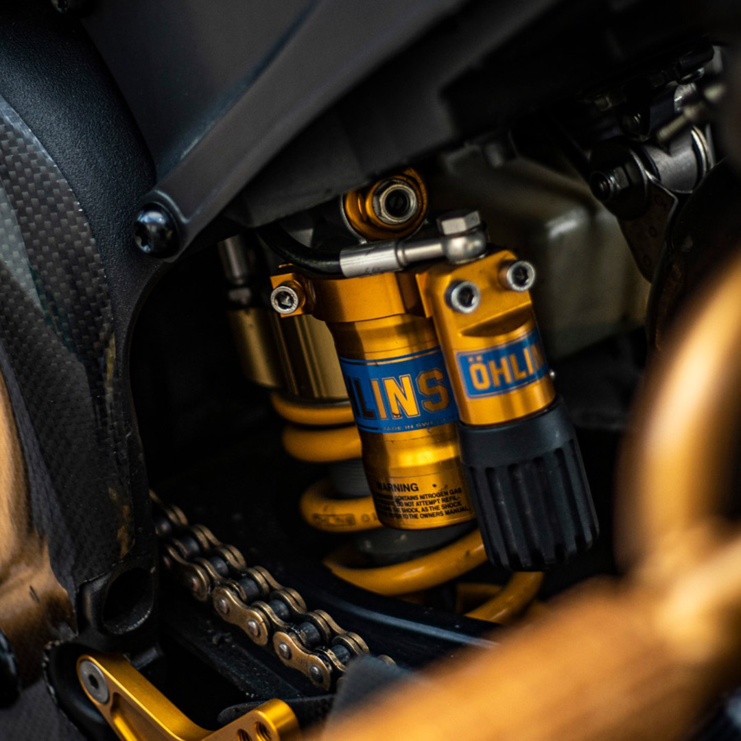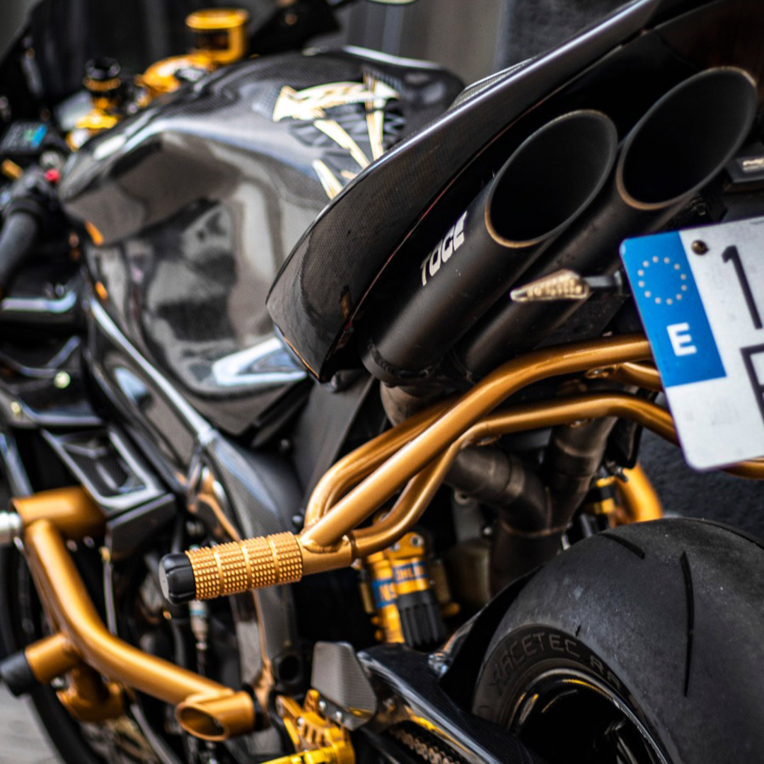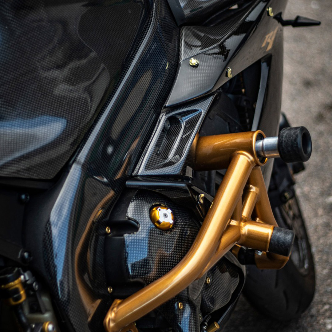 El encargo se basaba en realizar una combinación de carenado completo en fibra de carbono, junto a unos adhesivos dorados, a juego, estratégicamente situados en zonas muy, muy concretas. Aquí, nada se ha deja al azar, todo estudiado y medido milimétricamente.